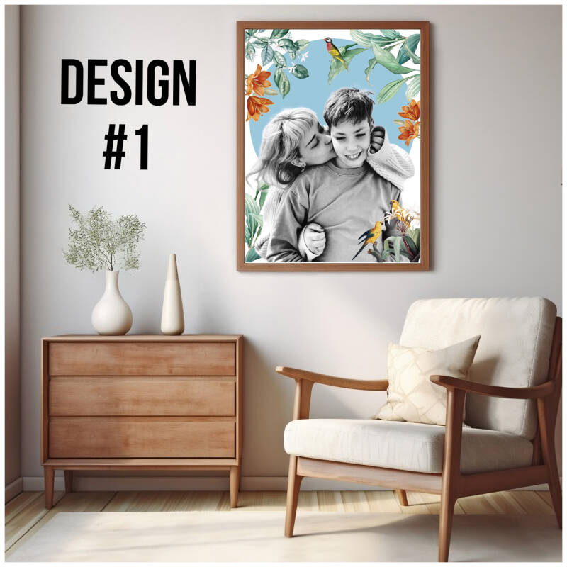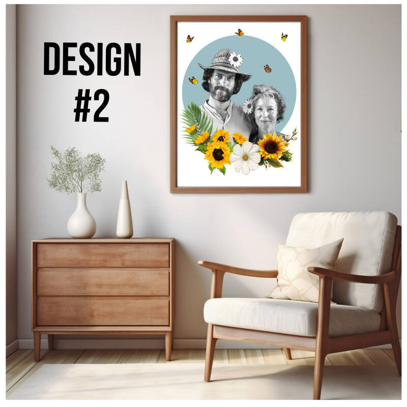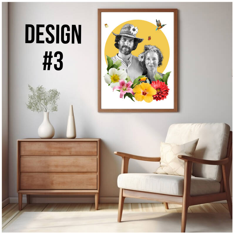 Je portret wordt omgezet in zwart-wit en lijkt op de voorbeelden op de in de designfoto's. Wel zal ik de botanische elementen aanpassen op een manier die bij het portret past.